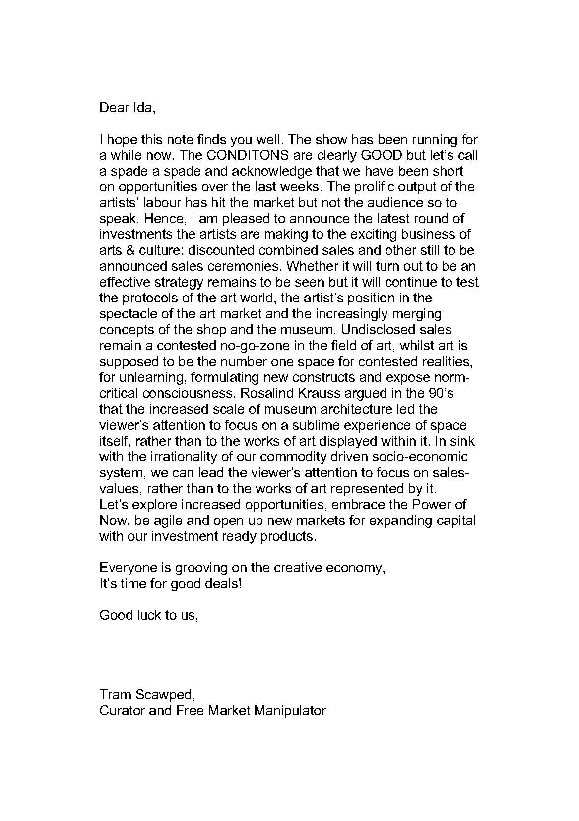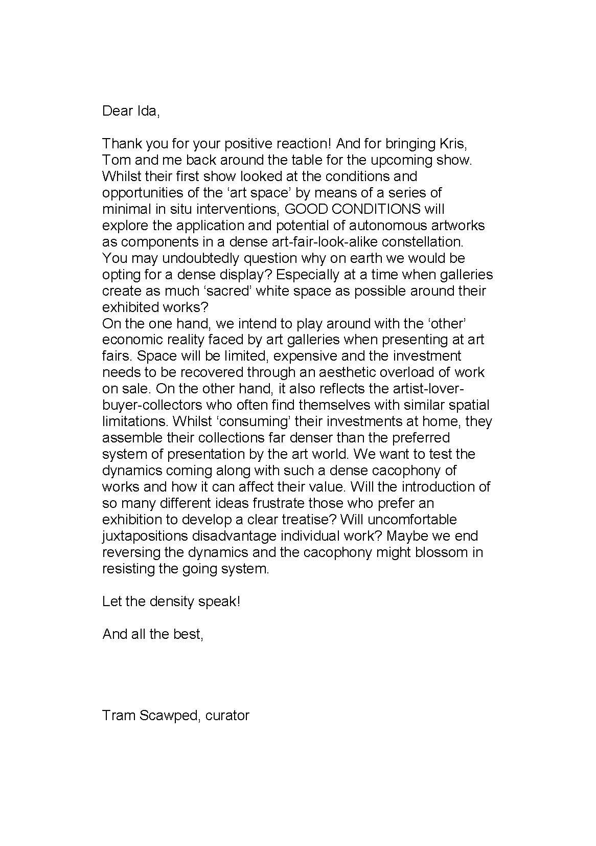 In Good Conditions, Kris Van Dessel and Tom Van Malderen build upon their previous collaboration Conditions and Opportunities at DMW Art Space in 2017. Together with curator Tram Scawped, the artists continue their quest into the protocols of exhibiting and the mechanism of the contemporary art economy in general. Their previous collaboration at DMW investigated the conditions and opportunities of the ‘art space’ by means of a series of minimal in situ interventions, ranging from subtle modifications of lighting and heating elements to enquiries into the appropriate shade of white for the walls of a white cube. Following up on this expo, 'Good Conditions' explores the application and potential of autonomous artworks as components of a dense art-fair-look-alike constellation. As part of this enquiry, all prices of the works on display are fixed in accordance with the inscrutable laws of the art economy and arranged in an easy-reference component list with accompanying article numbers.