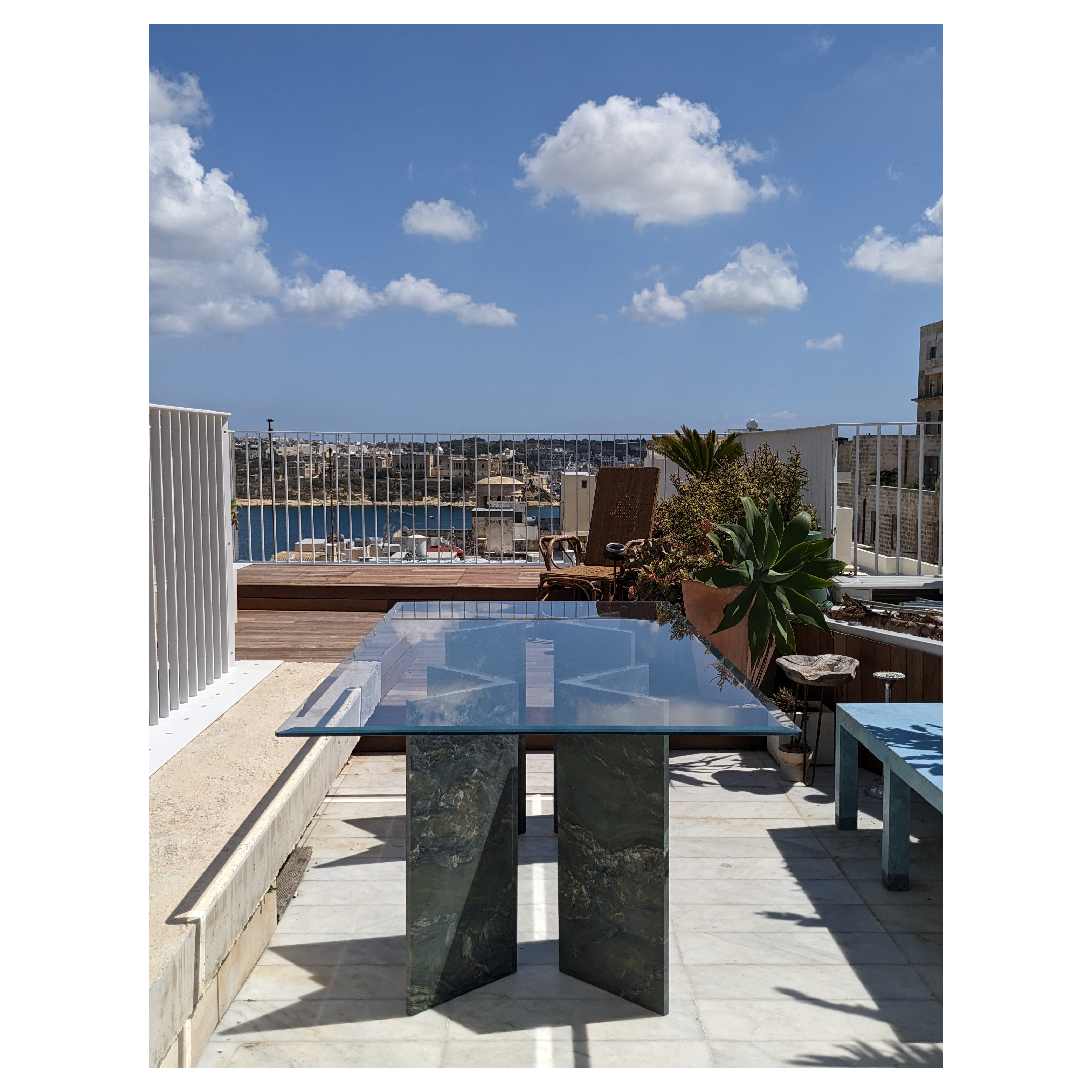 Marble table legs design, recycling the glass table top of a Don Cavalletto Glass Dining Table by Jean-Marie Massaud for glasItalia. 4 identical legs that slide into each other and can hold the table top upright, to the side, in case the client wants to free up the roof. Separate legs to reassure they could be carried up to the roof in the first place. Produced from the cutoffs of two marble slabs by @rlautier_naturalstone