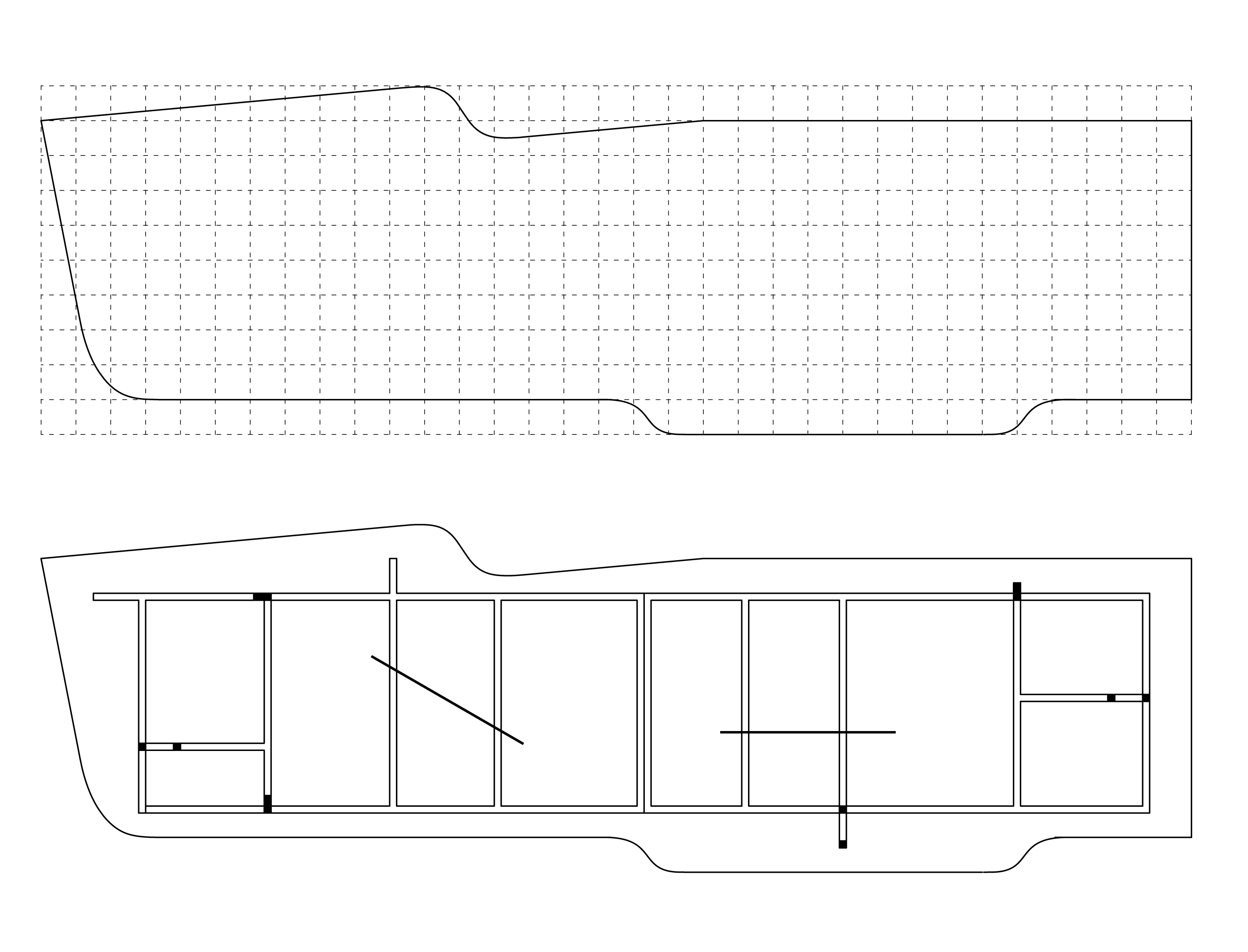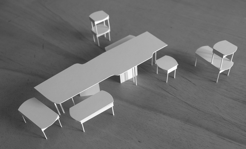 To retain playfulness and lightness structurally, the weight and span of the 3.3m long table rests on a forest of thin steel legs and flanges. Although appearing random, all supporting elements are set out on a grid to provide twelve clear seating 'pockets' for legs and knees. Similar to the table legs fragmenting the floor space, the complimentary shelving element is designed with gentle twists to find a balance between structural stability, usability and sculptural qualities. As a subtle uniting detail, edged profiles along the seating and shelving provide additional strength to the shelves and ease when moving the benches around.